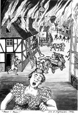 Bei dem großen Dorfbrand im Jahre 1892 fiel diese Kirche samt Kirchturm mit Glocken den Flammen zum Opfer. Unter Lebensgefahr konnte der damalige Pfarrer Wilh. Ney noch das Sanktissimum aus der Kirche retten.