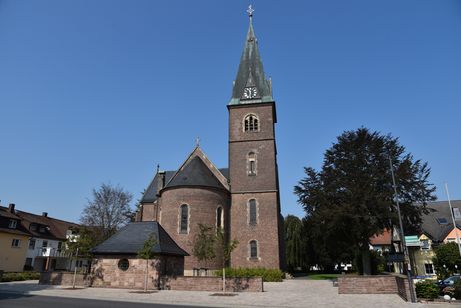 Die Kirche wurde im neuromanischen Stil auf einem kreuzförmigen Grundriß mit Apsis erbaut (kreuzförmig als Sühne für die Greueltaten im Bauernkrieg). Die Fassade ist durch eine Blendrosette belebt, im Bogenfeld des Hauptportals sitzt eine Sandsteinplastik des Guten Hirten. Über den Seitenportalen befinden sich moderne Steinplastiken, rechts Christophorus und links Maria Goretti (m. Schlange u. Messer).