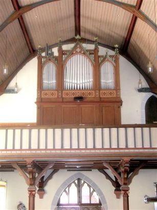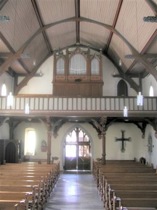 Hier ist der Innenraum nach Westen zur Eingangsseite dargestellt. Auf Steinkonsolen stehen Holzpfosten, die die Empore abstützen. Die Orgel ist von 1890 und wurde von der Fa. Gido Knauf, Gotha gebaut. In 2007 wurde eine große Orgelrenovierung durchgeführt.
