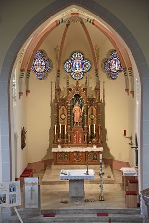 Der neugotische Hauptaltar stammt aus der Kirche in Rasdorf und wurde 1985 eingebaut. Die Renovierungsarbeiten führte der Bildschnitzer Hermann Langgut aus Elters durch.